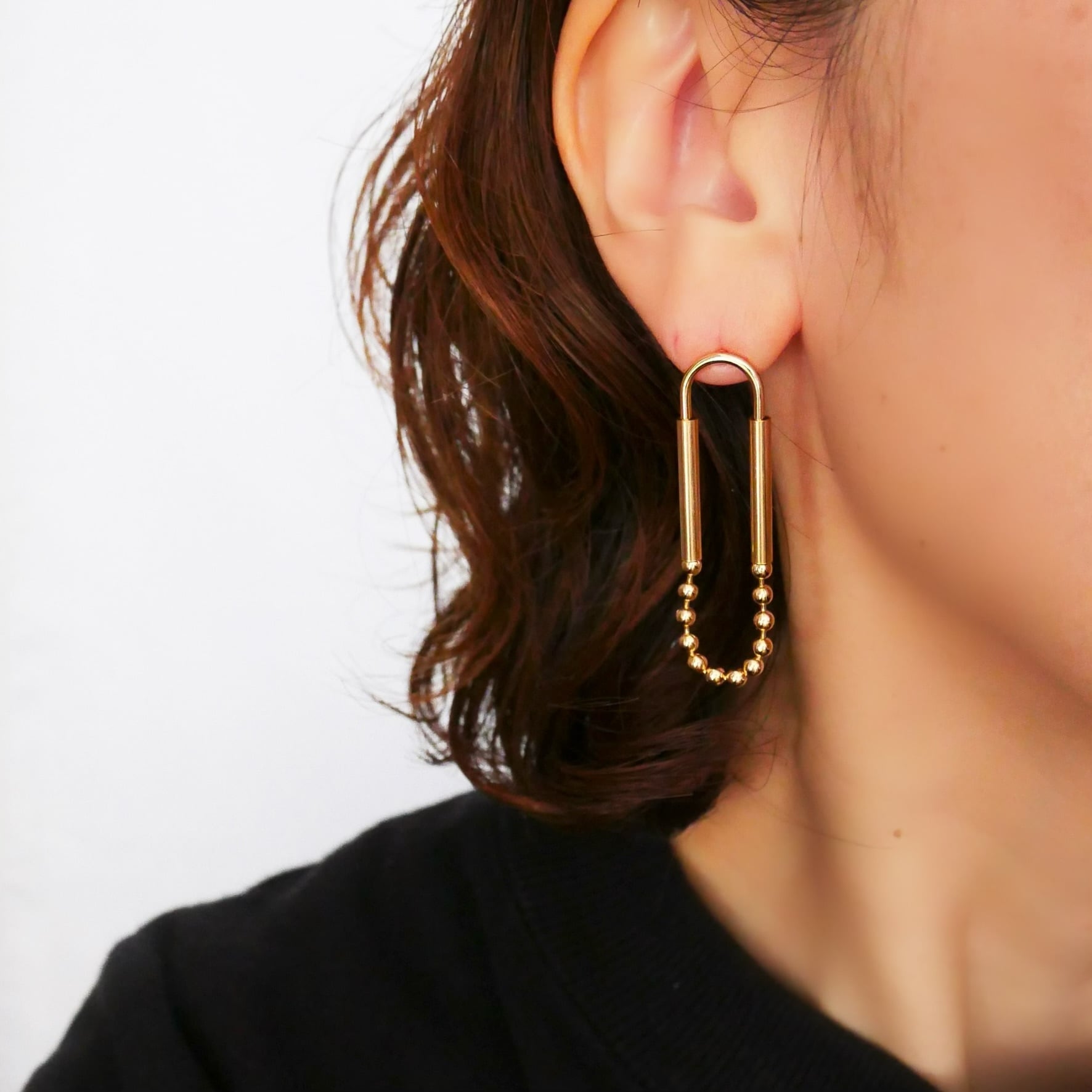 ユラユラと揺れるボールチェーンが耳元で輝きを放ち、女性らしさとスタイリッシュさを併せ持つデザインになっています。
